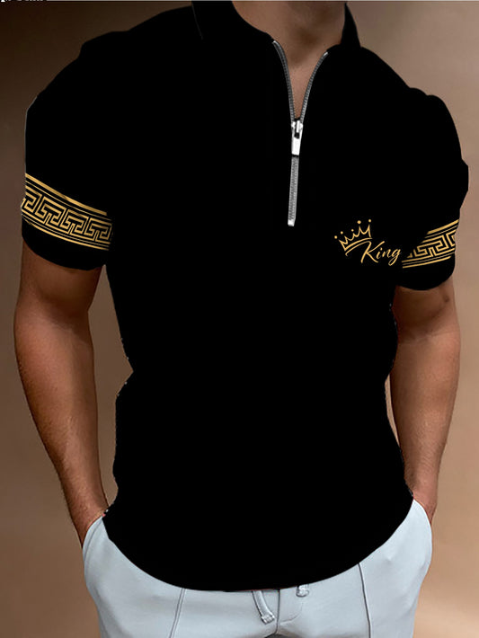 Men's Fashion Stand Collar Zip Short Sleeve Shirt Trendy Geometric Pattern Crown Letter Print Casual T-Shirt||,