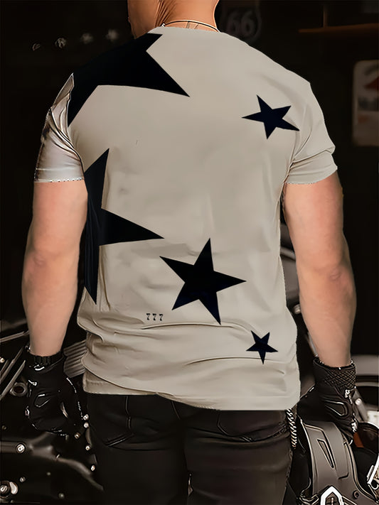 3D Print Streetwear Graphic Tee - Casual Short Sleeve Crew Neck, Black White Star Design with Bold "19.74meter Print, Lightweight Polyester Blend for Casual Attire, Streetwear Fashion Bold Graphic Tee Stretchy Fabric
