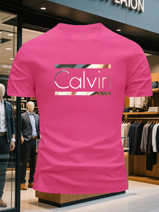 Men'S Bright Pink CALVI Graphic T-Shirt - Soft Breathable 100% Cotton Crewneck Tee, Everyday Casual Shirt for Office, Outings Gym - Minimalist Modern Top, Comfortable Clothing, Stylish Letter Print, Durable Fabric, Short Sl