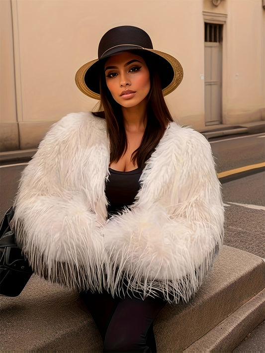 Women's Elegant White faux fur coat - Luxury Winter Outerwear with Single-Button Closure, Machine Washable Cold-Weather Jacket for Evening Events, Parties & Everyday - Chic Winter Coat for Women (Solid Color, O-Line Silhouett