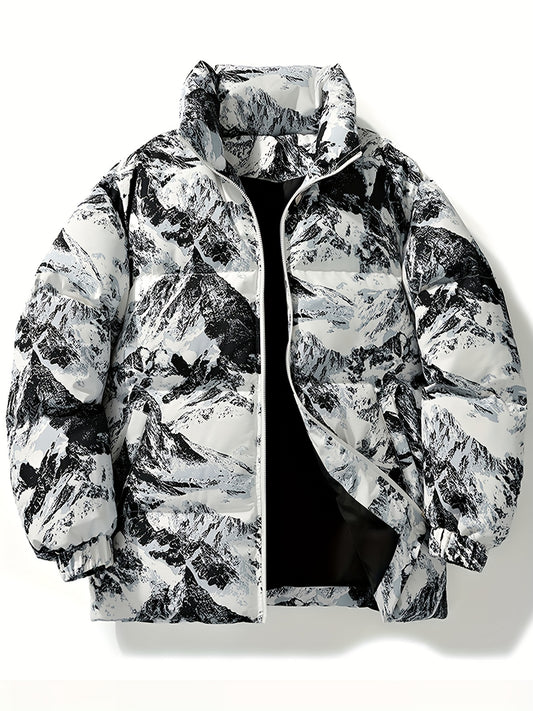 Men's Winter Mountain Camo Hooded Jacket with Insulating Polyester Fill - Stand Collar & Zippered Pockets, Machine Washable Outdoor Coat for Hiking, Camping, Casual Wear - White/Black/Gray (Regular Fit) by Ocean Muai Xing