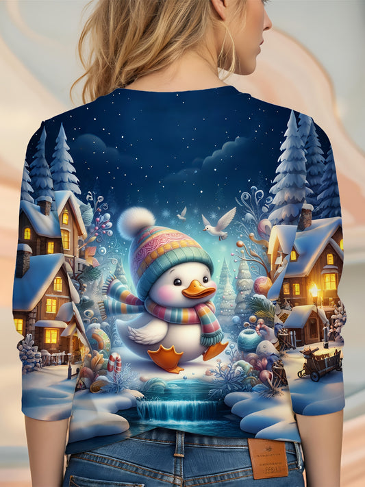 The 's heart is bursting! Warm hat duck snow view T-shirt, Women's casual, comfortable and elegant top, Women's round neck long sleeved T-shirt, Women's fashionable long sleeved T-shirt