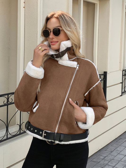 Women's Elegant Plush Full-Zip Winter Jacket - Soft Pink Long Sleeve Coat with Collar, Machine Washable, Warm & Stylish Outerwear for Fall and Winter, Casual to Semi-Formal Occasions
