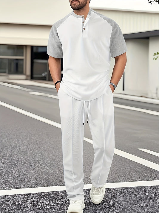 Men's Casual Mixed Color Spliced Set: Shirt and Drawstring Pants, Clean and Comfortable