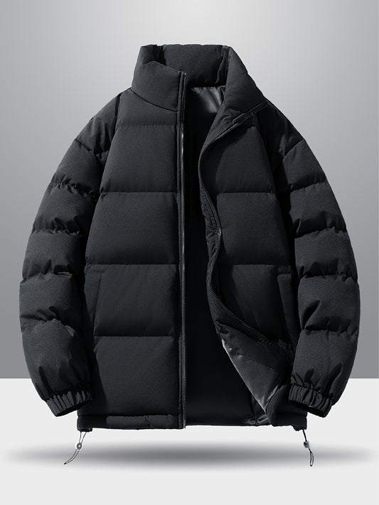 Men'S 2025 New Casual Jacket - Black, Stand Collar, Zip-Up, Long Sleeve, Polyester Filled, Winter Coat with Adjustable Drawstring Hood