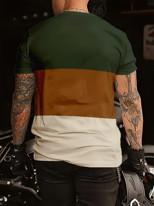 Striped Patchwork Design Pattern Print, Men'S Sports Fashion, Geometric Print High Elasticity Tight Fit Short Sleeved Round Neck T-Shirt, Summer Fitness, Training And Fitness Wear Quick Drying Sports Top with Coolness