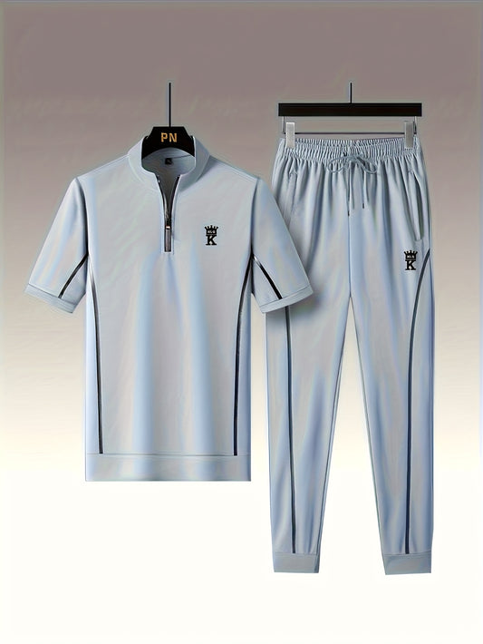 Men'S Casual 2pcs Set Knitted: Zipper Short Sleeve Shirt and Drawstring Pants - Black, Polyester, Suitable for Spring/Summer Casual Wea