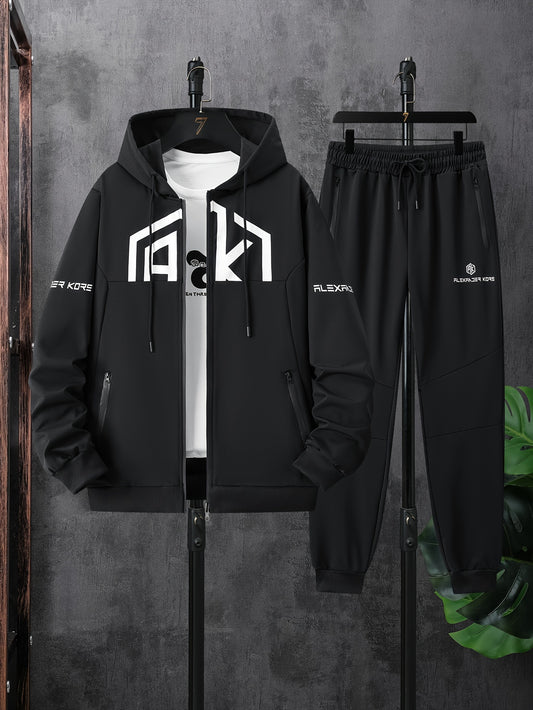 Men's AK Letter Print Long Sleeves Hoodies With Zipper Detail & Long Pants Two-piece Set, Slight Stretch Comfortable Clothing For Spring And Autumn