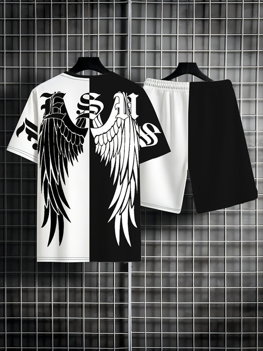Men's Summer Fashion 2pcs Set: Gothic Wings Print T-Shirt & Shorts - Casual Beachwear, Athletic Loungewear, Machine Washable
