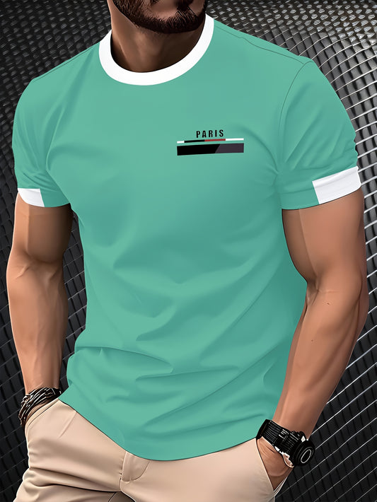 Men'S Paris Graphic T-Shirt - Green Polyester Crew Neck Tee with White Stripes Print - Casual Sporty Knit Top for Casual Attire, Breathable Fabric