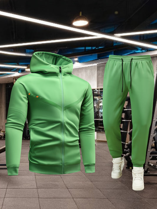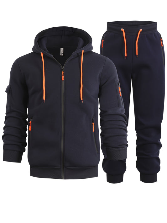 Men's Two-Piece Sportswear Suit: Zipper Hoodie + Sweatpants Set, Spring/Autumn Solid Color Regular Long Sleeve Zipper Hoodie with Drawstring, Threaded Trousers, Casual Sportswear Two-Piece Set