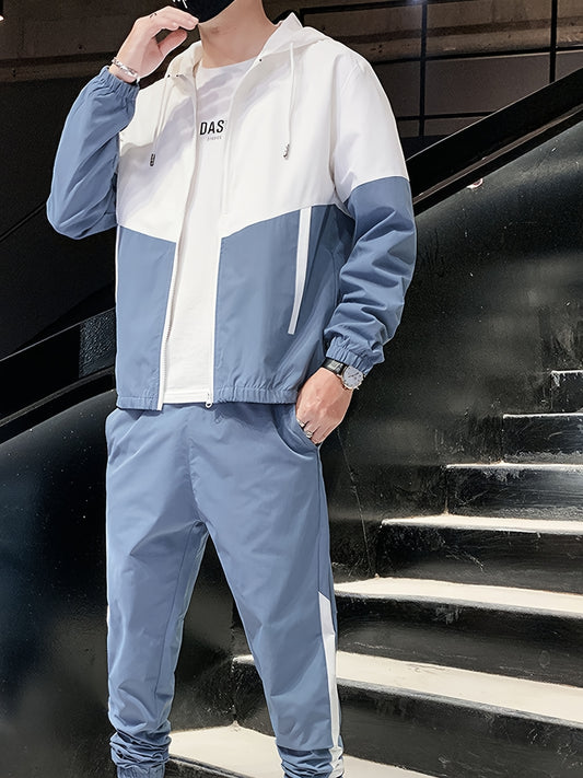 2pcs Men'S Casual Sportswear Set - Color Block Hooded Jacket and Pants, Polyester, Machine Washable, All-Season, with Pockets, Regular Fit, Spring Sportswear|Hooded Sportswear|Machine Washable Fabric