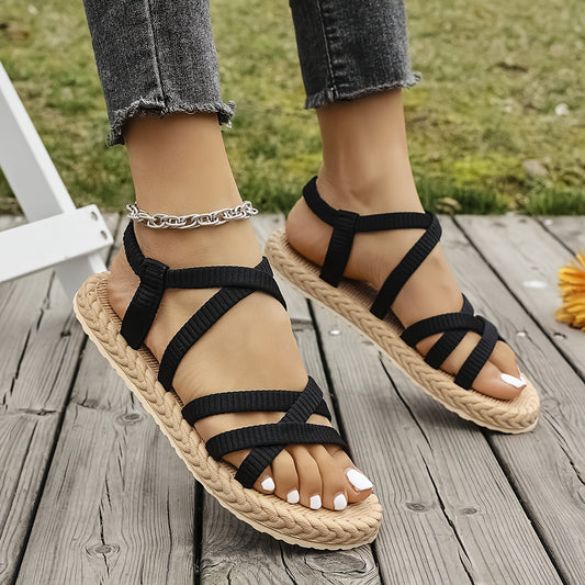 Women's Stylish Black Flat Sandals with Adjustable Ankle Straps - Breathable Fabric Upper, EVA Sole, Low Heel for Casual Wear, Beach, and Spring Outings, Strappy Sandals