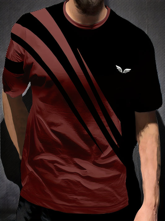 Men's Black 3D Geometric Print T-Shirt – Casual Short Sleeve Summer Tee with Red Gray Accents, Round Neck, Machine Washable for Outdoor Sports, Everyday Comfort, Durable Fabric