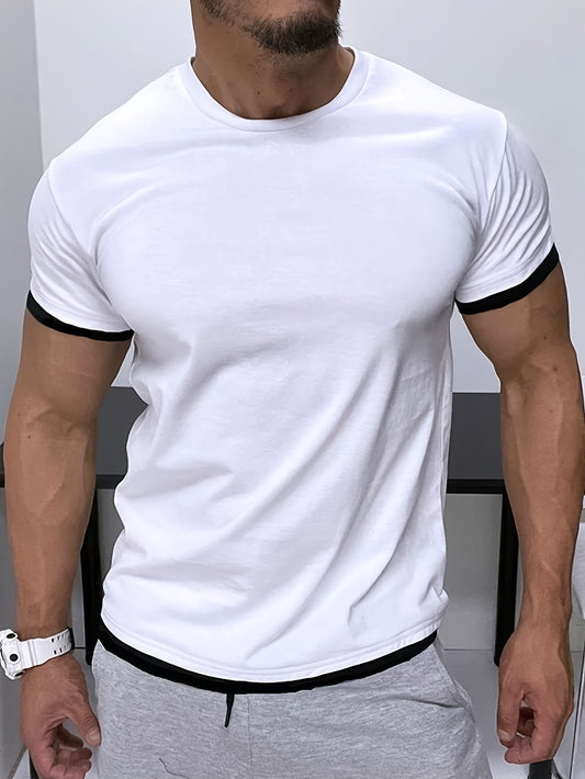 Men's Classic Summer Casual Short Sleeve T-Shirt - Black with White Trim, Round Neck, Stretch Fabric, Comfortable Stylish for Casual Attire, Twiceiquest Fashion Faux Twopiece Smooth Texture