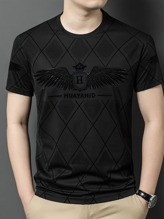 SINBOS Men's 2025 Summer Short Sleeve T-Shirt - Black Casual Graphic Print Tee with Wing HUYAND Logo Design, Breathable Stretch Fabric, Round Neck Regular Fit for Casual Attire, Nontransparent Material, Relaxed Fit, Trendy