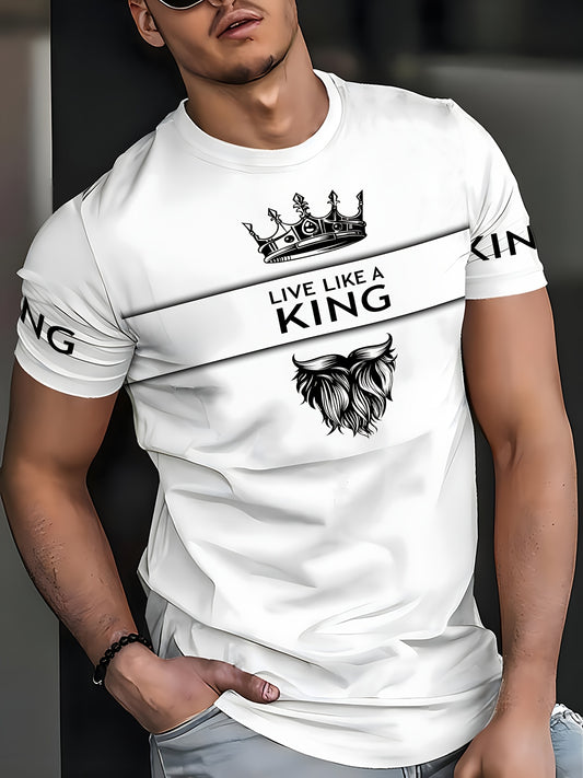 Men'S Black White Star Stripe T-Shirt with "King" Print - Casual Round Neck Short Sleeve, Curved Design, Breathable Fabric for Summer, Casual Attire, Comfortable Fit