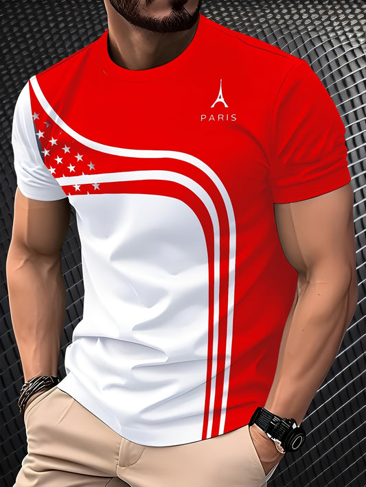 Men'S Vintage Eiffel Tower Graphic T-Shirt, 3D Printed, 100% Polyester Round Neck Tee with American Flag Design, Geometric Knit Fabric, Regular Fit with Slight Stretch, 150gsm, Casual Summer Short Sleeve for Outdoor Sports