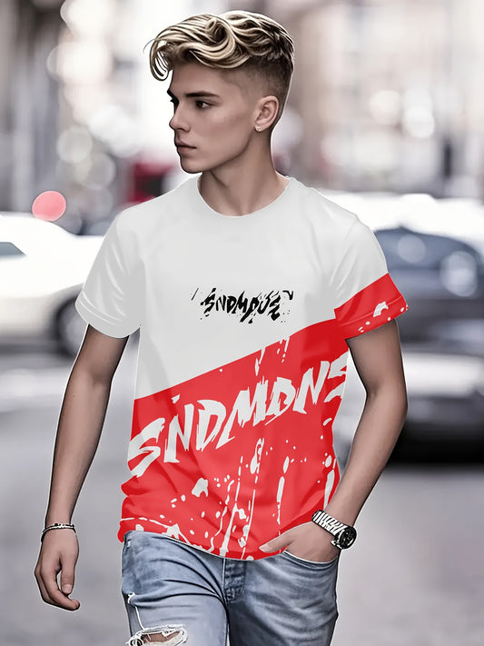 Men's 3D Digital Print Color Block Crew Neck T-Shirt - "sndmns" Graphic Design, Casual Sporty Short Sleeve Tee for Summer Outings, Machine Washable, Casual Sportswear Dynamic Print Tee Durable Fabric