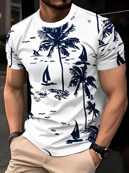 Men'S Quick-Dry Tropical Palm Tree Print T-Shirt - Breathable Round Neck Casual Tee for Summer, Outdoor Daily Wear, Lightweight Comfortable Fit, Outdoor Tshirt Tropical Print Shirt Comfortable Fit