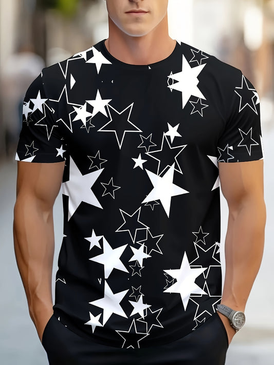 Men's Allover Color Blocking Stars Pattern Short Sleeve Crew Neck T-shirt For Summer, Casual Stylish Tee As Gift