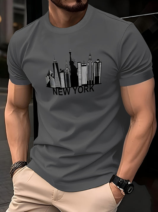 Men's Quick-Dry Summer T-Shirt with New York City Skyline Graphic Print - Breathable Moisture-Wicking Fabric, Regular Fit Round Neck Tee for Casual Outdoor Wear, Machine Washable, Comfortable Fit