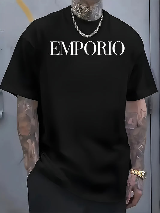 2025 New Men'S Casual Short Sleeve T-Shirt - "EMPRIO" Print, Black with White Lettering, Lightweight Breathable Fabric, Perfect for Summer Beach Outings Outdoor Adventures, Beach T Shirt