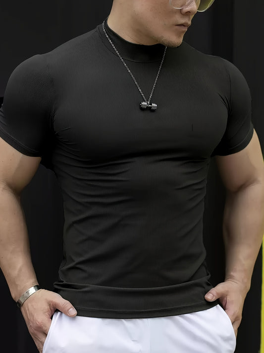 1pc Men'S Athletic High Neck T-Shirt - Quick Dry, Compression Workout Top, Short Sleeve, Solid Color, Stretch Fabric, Summer Sports Tee for Training Running
