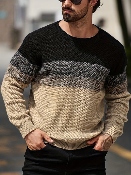 Men's Fashion Color-Block Striped Crew Neck Long Sleeve Casual Pullover, Trendy Elastic Warm Knitwear for Winter Outdoor Activities
