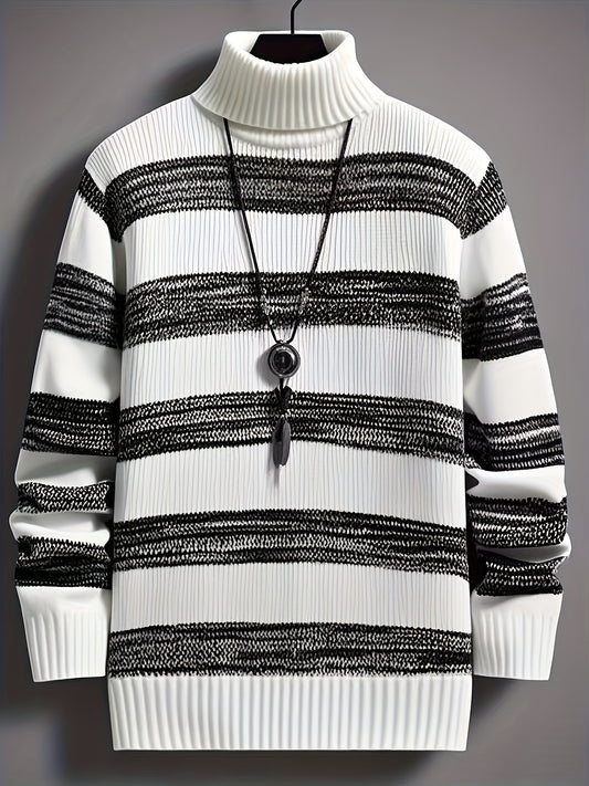 Men'S Stylish Black & White Striped Knit Pullover Sweater - High Neck, Long Sleeve, Ribbed Cuffs, Casual Fall/Winter Wear, Casual Wear Sweater | Highneck Sweater | Knit Construction, Sweater Vest