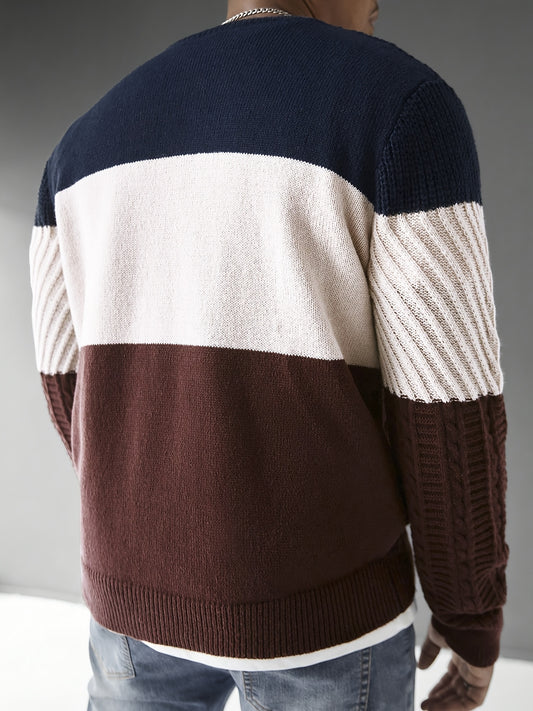 Men's Autumn and Winter Color Block Knit Sweater, Crew Neck Pullover