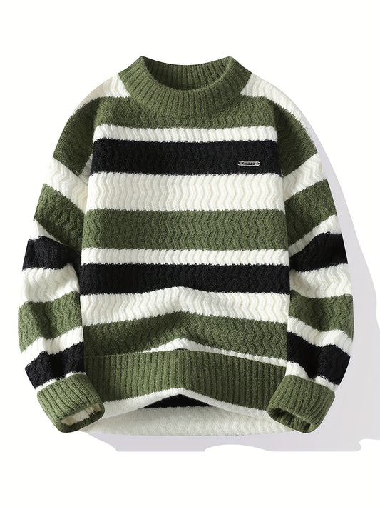 JNBLDA Chic Striped Knitted Sweater, Men's Casual Warm Stretch Round Neck Pullover Sweater for Fall Winter