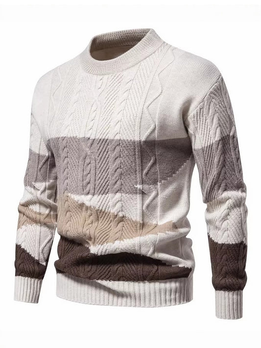Men's Winter Warm Thick Knit Sweater - Color-Block Round Neck Pullover with Sleeve, Casual & Suitable for Evening Dates, Machine Washable Sweaters for Weather