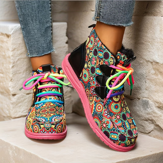 Women'S Retro Ethnic Floral Print Snow Boots - Plush Lined Winter Boots with Adjustable Lace-Up Straps, Round Toe & PVC Sole for Warmth, Comfort & Traction - Vibrant Colors for Casual & Formal Outfits, Winter Boots, Seasonal