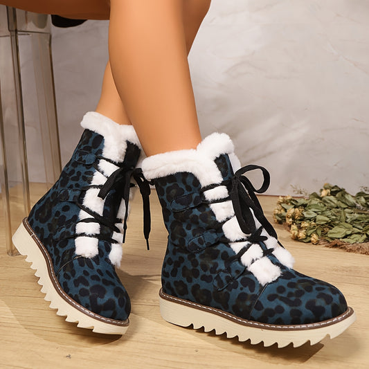 Women's Leopard Print Winter Boots with Flat Sole & Lace-Up Closure - Blue Round Toe Fabric Upper, Rubber Traction Outsole for Cold Weather Comfort, African-Inspired Fashion Footwear, Cold Weather Gear, Comfortable Boots, War