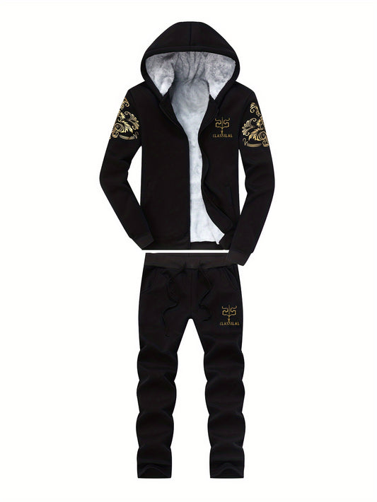 Men's "SHAN YES" Alphabet Print Fuzzy Lining Hooded Sweatshirt And Joggers Set, Warm Athletic Outfit For Running And Outdoor Fitness, Autumn And Winter