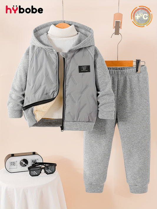 1 Set of 2pcs [Warm Fleece Jacket Set for Boys] Comfortable Fleece Jacket Boy Zip Hoodie And Pants Set | Letter Print, Long-Sleeved Casual Sportswear with Pockets, Perfect for Autumn And Winter Jogging And Outdoor Activities,