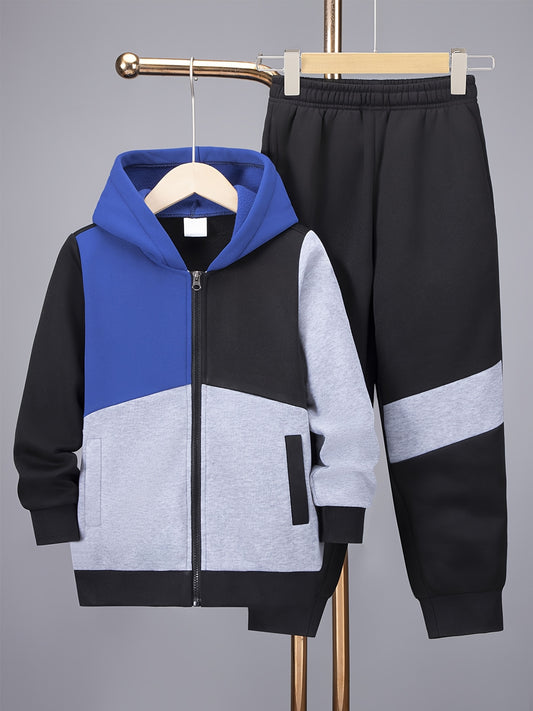 2pcs Boys' Winter Hooded Sweatsuit & Pants - Warm Sweater Outfit with Matching Long Pants, Colorblock Hoodie (Suitable for & Big Kids) - Machine Washable 2pcs set, Perfect for Outdoor