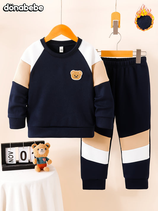Autumn and Winter Round Neck Sweatshirt Long Sleeve Three-Color Patchwork "Cute Bear" Label Casual Comfortable Simple Trendy Versatile Casual Pants 2pcs Set, Perfect for Outdoor