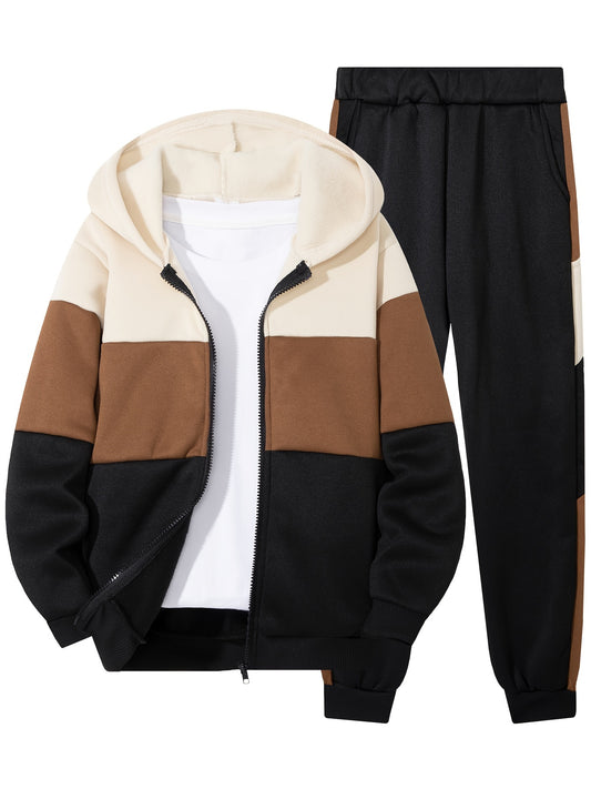 A Two-Piece Set for Boys Featuring a Casual Zip-Up Hoodie And Sweatpants, Designed with Trendy Color-Blocking for a Comfortable And Warm Autumn-Winter Sports Outfit, Perfect for Jogging And Everyday Wear, for Outdoor