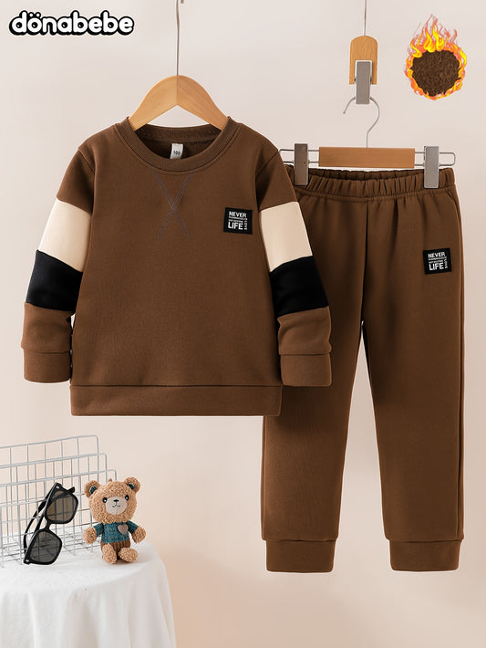 Baby Boys' Winter Warmth Fleece-Lined Sweatshirt & Pants Set - Soft & Brown Round Neck Outfit with Cuffs, Machine Washable Toddler Clothes for Autumn/Winter, Cozy Casual Playwear for Cold Weather, for Outdoor, Thick