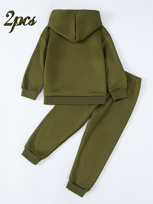 Boys' Cozy Fleece-Lined Hoodie & Sweatpants Set - Olive Green Casual Winter Outfit with Pockets, Thick Warmth for Fall & Winter, Regular Fit, Casual Attire, for Outdoor