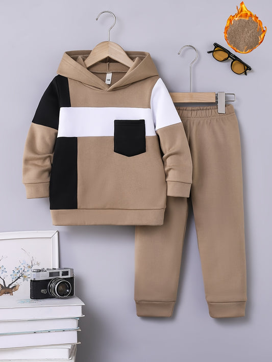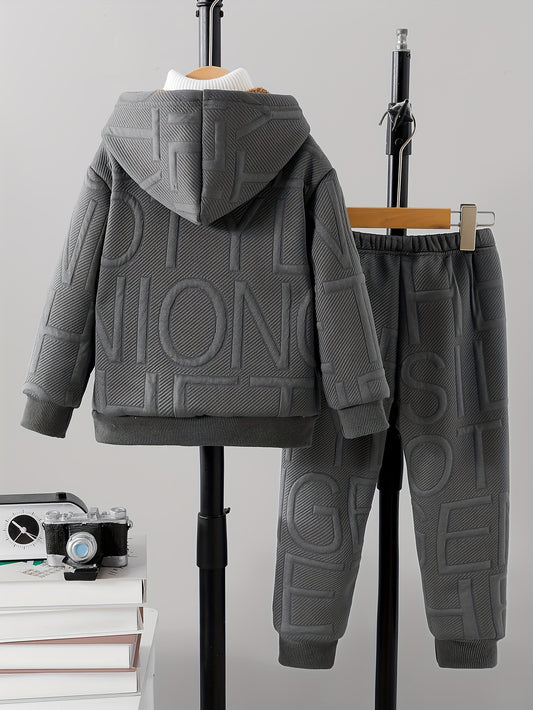 2pcs Boys' Winter Fleece-Lined Hooded Zip-Up Jackets with Elastic Waistband & Contrast Color Block Design - Casual Outdoor Wear for Autumn/Winter, Stylish Letter Pattern, Cozy Fleece Pants, Perfect for Outdoor, Thick