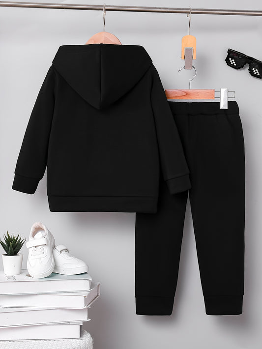 2pcs set of casual and fashionable fleece thickened Jacquard zipper pocket shoulder-length hooded sweatshirt and fleece Jacquard sports jogging pants suit, children's autumn and winter comfortable and versatile clothing, can