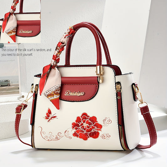 Embroidered Colorful Wo 'S Handbag with Random Scarf Color, Business Spring/Summer Date, Casual Travel, Mother'S Day Gift, Large Capacity, Middle-Aged, Commuting, Contrast Color