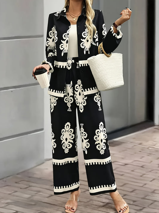 • New Fashionable Elegant Simple Casual Women'S Printed Shirt Pants Jacket Set Three-Piece