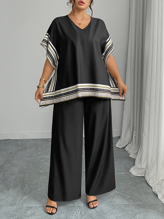 • Women's Elegant Printed Short Sleeve Round Neck Shirt and Long Pants Set
