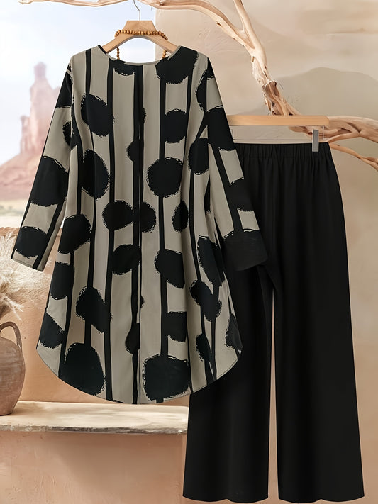 • Women's Casual Round Neck Printed Long Sleeve Top and Solid Color Pants Two-Piece Set