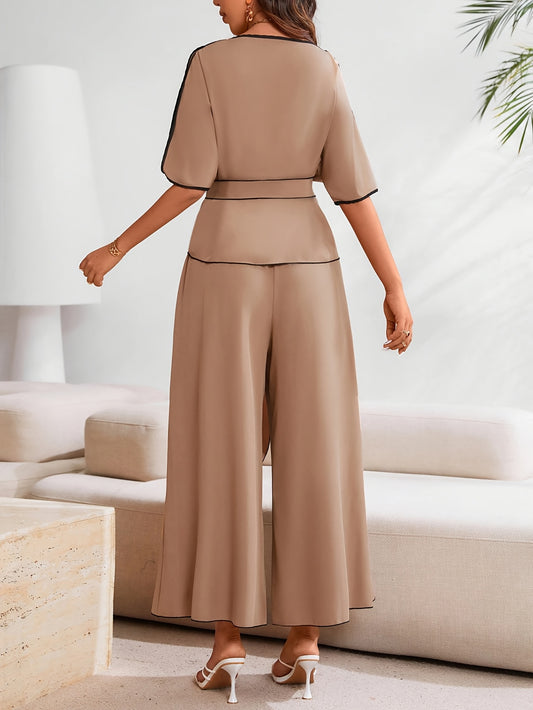 • Solid Color Button Elegant Set, Flutter Sleeve Crew Neck Top & Wide Leg Loose Fit Pants, Women's Clothing