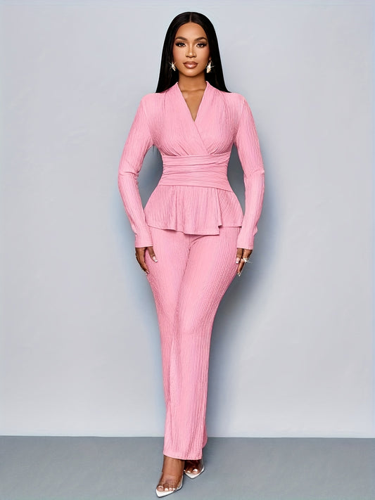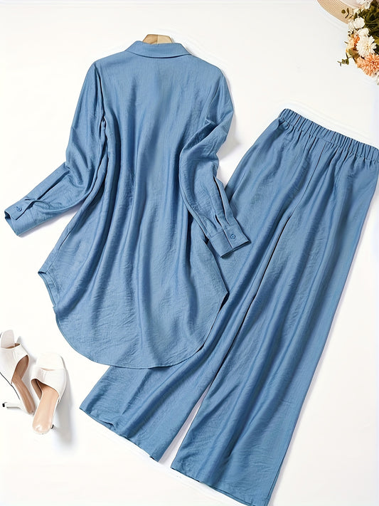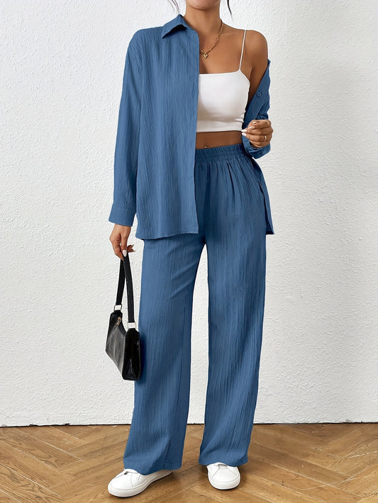 • Two-Piece Women'S Solid Color Long Sleeve Shirt and Pants, Minimalist Everyday Casual Fashion Set [NS702], Polyester, Contrast Lace Detail, Elegant Style, for Spring/Summer